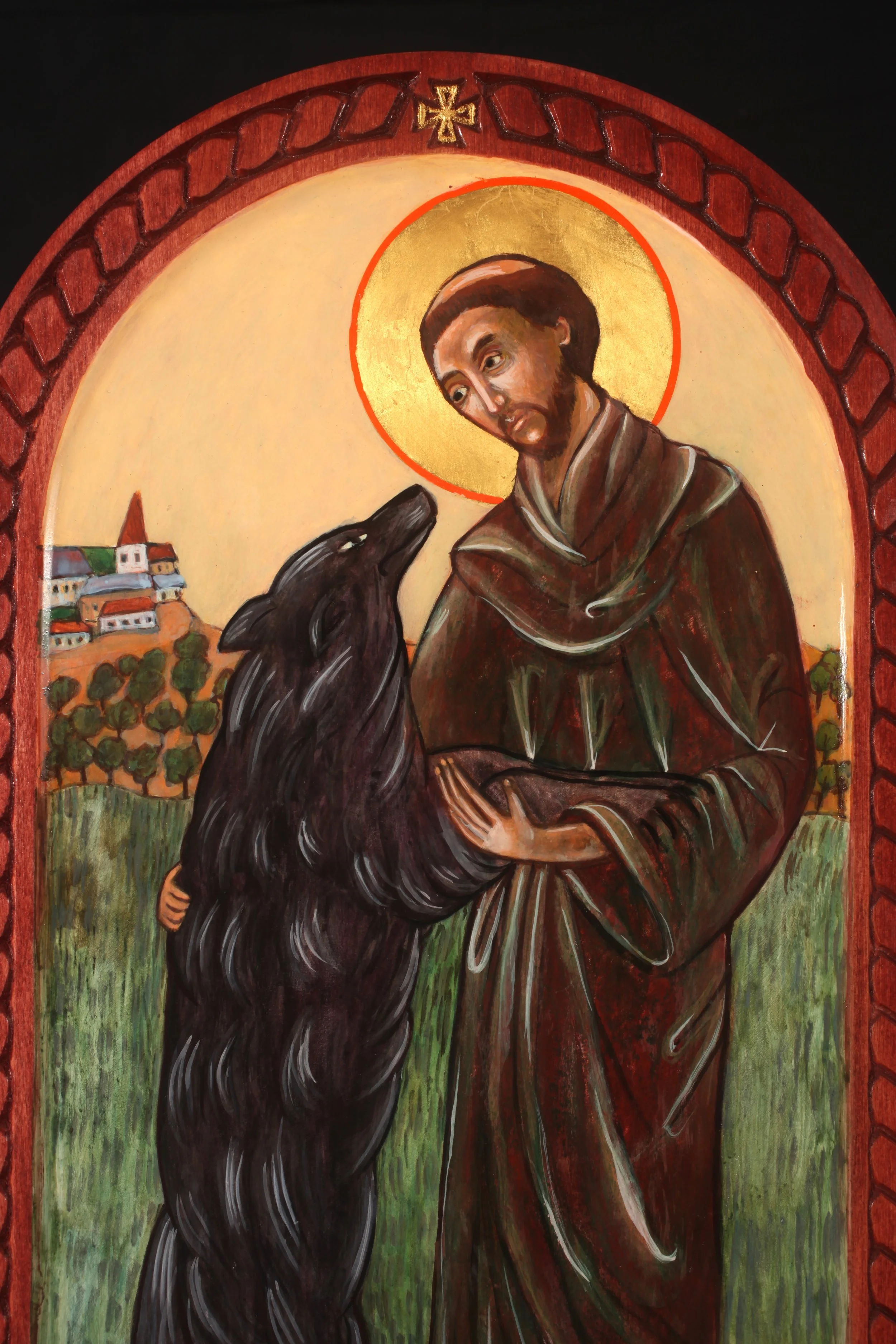 We will be painting an icon oSaint Francis and the wolf of Lubbio, using egg tempera on gessoed wood panel with gold leaf gilding, in the traditional Byzantine method. It’s a lovely and meaningful icon to paint, and you do not need to be an artist to paint an icon! I give step by step demonstrations and supply the drawing for the icon as well as all of the materials.